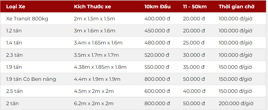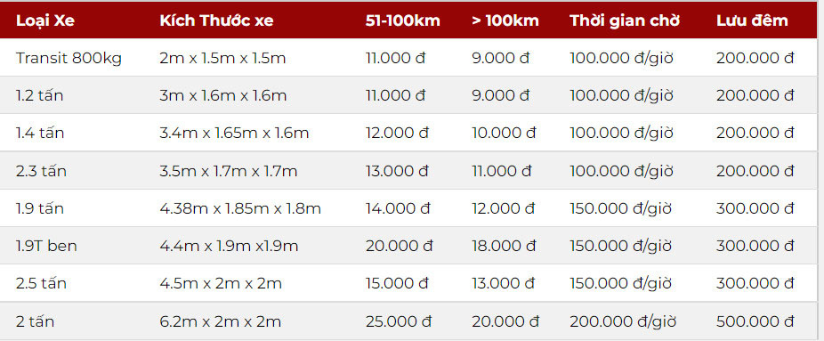 Công ty chúng tôi có :Xe tải 750kg, 1.5 tấn, 2 tấn, 2.5 tấn, 5 tấn,…