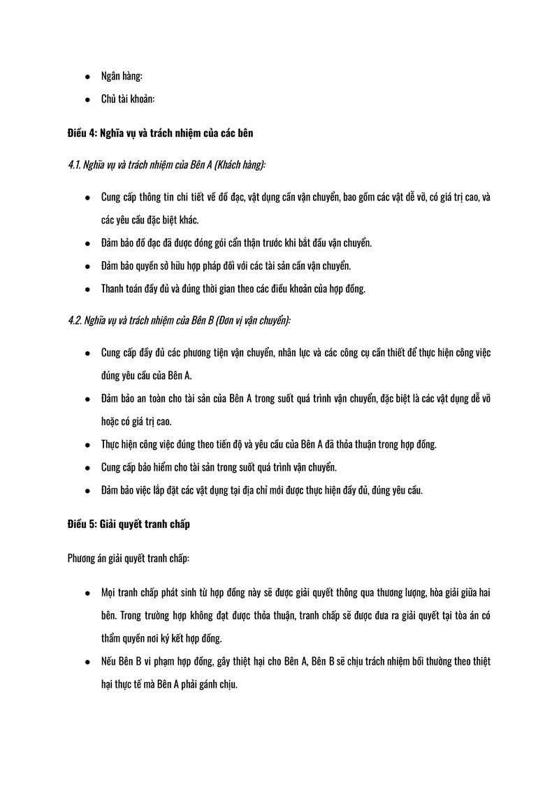 Nghĩa vụ của khách hàng là cung cấp thông tin chính xác về tài sản cần vận chuyển, có trách nhiệm phối hợp với đơn vị vận chuyển trong việc tạo điều kiện thuận lợi cho việc di chuyển, thông báo về các yêu cầu đặc biệt (nếu có). Trách nhiệm của đơn vị vận chuyển là đảm bảo quá trình vận chuyển diễn ra an toàn, đúng thời gian đã cam kết và không làm hư hỏng tài sản của khách hàng. Đơn vị vận chuyển phải sử dụng phương tiện phù hợp, nhân lực đủ trình độ và có trách nhiệm bảo vệ tài sản trong suốt quá trình thực hiện Dịch vụ - Kubet - Kubet - Kubet - Kubet - Kubet - Kubet - Kubet.