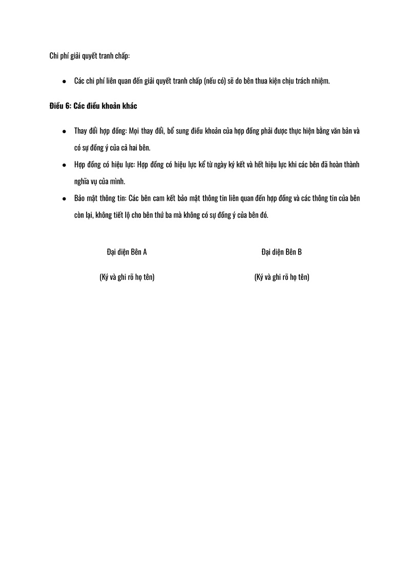 Bên cạnh đó, hợp đồng cũng cần có cơ chế giải quyết tranh chấp trong trường hợp không thể tự giải quyết. Các phương án như hòa giải hoặc xử lý qua tòa án phải được thống nhất trong hợp đồng, tạo khung pháp lý rõ ràng để giải quyết mọi mâu thuẫn một cách công bằng và hiệu quả. Điều này giúp các bên yên tâm hơn trong suốt quá trình thực hiện hợp đồng, đồng thời tránh được những tranh chấp không đáng có.